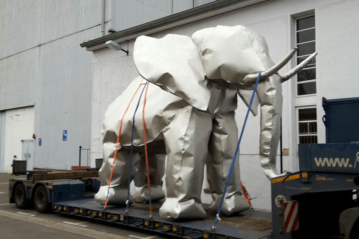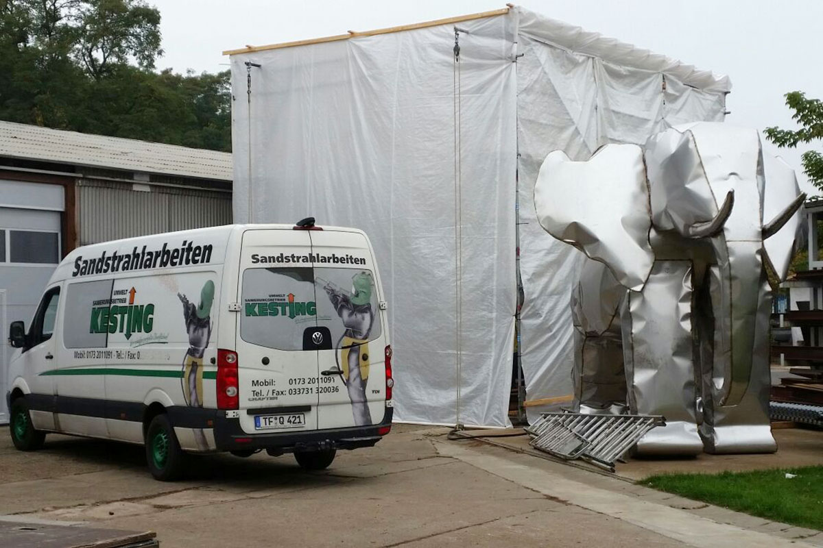 Sandstrahlen als Oberflächenbehandlung (Mattieren) von Edelstahl, z.B. Elefanten-Skulpturen bis 4,5 Meter Höhe